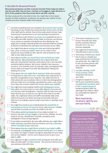 We have produced a “Bereavement Checklist” of things for bereaved parents to think about if their baby has died or is going to die. Many bereaved parents can feel numb and shocked if their baby has died or may die soon after they are born, and they can struggle to make decisions or think of the questions that they would like to ask their midwife. We have produced this checklist to help. Bereaved parents might like to think about answers to these questions, so that they can express their wishes in relation to their baby to their midwife and other relevant staff in the hospital.