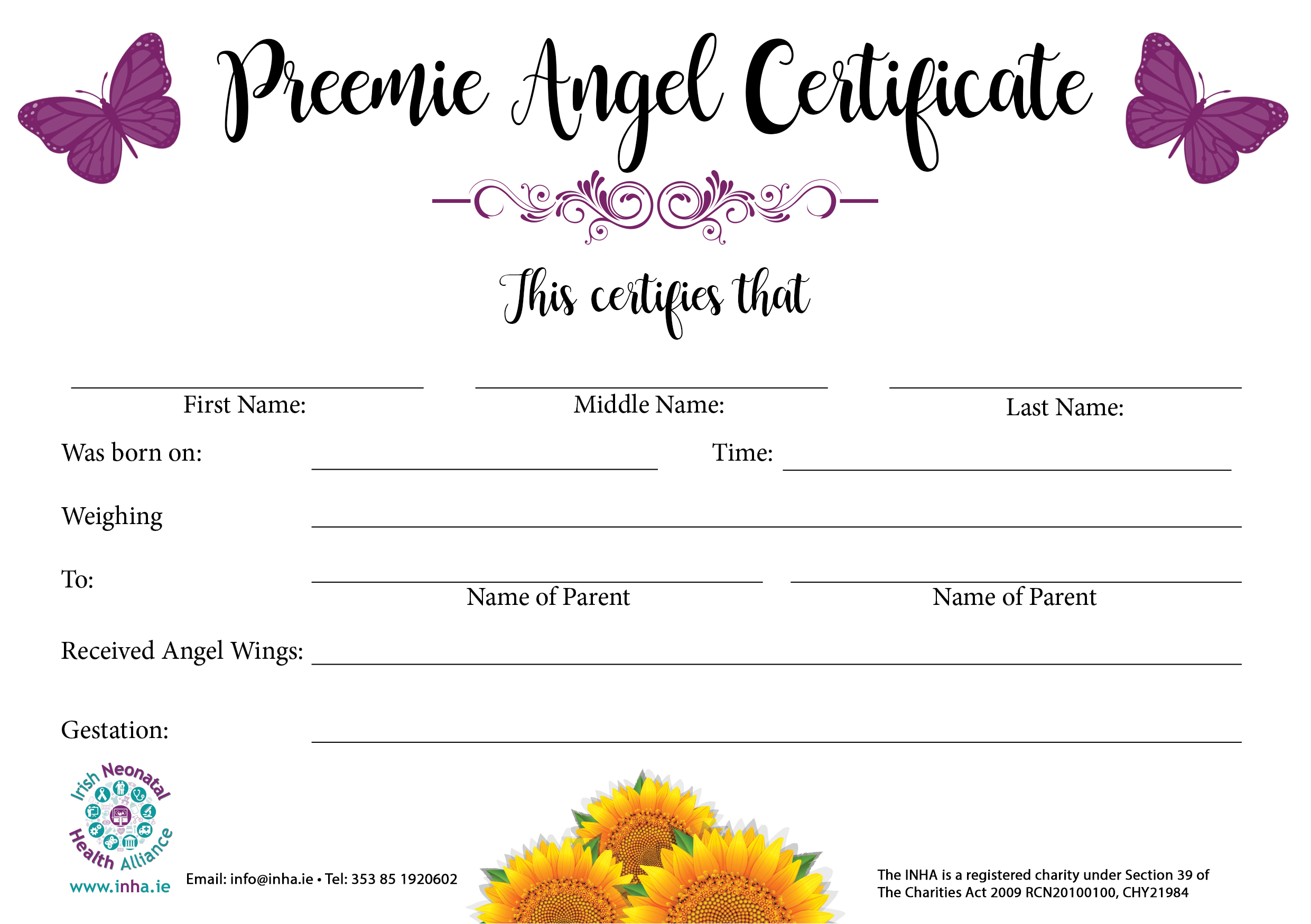 Sadly, if a baby dies before 24 completed weeks of pregnancy or is under 500g showing no signs of life, his or her birth cannot be entered into the Register of Stillbirths under the Stillbirth Registration Act 1994. This can be very upsetting for bereaved parents. Families who lose their baby are left feeling that their baby did not count. Many bereaved parents want their baby to be acknowledged and named. To assist with this, the INHA has produced a Certificate of Life which hospital staff can download and print off and offer it as an option to the parents as way of the hospital acknowledging their loss. You might like to complete the certificate with the parents.